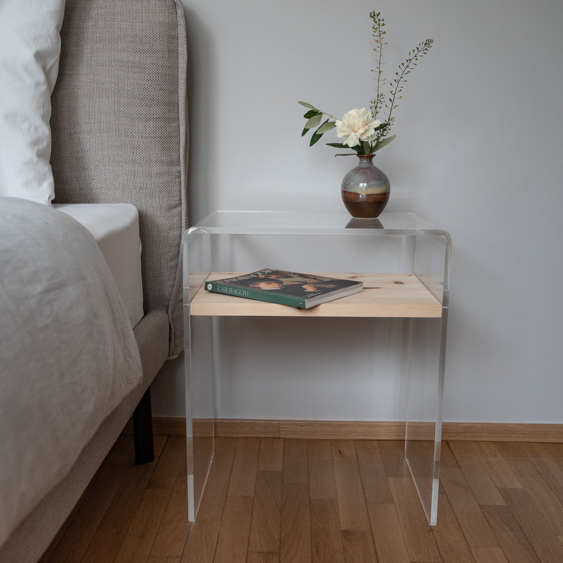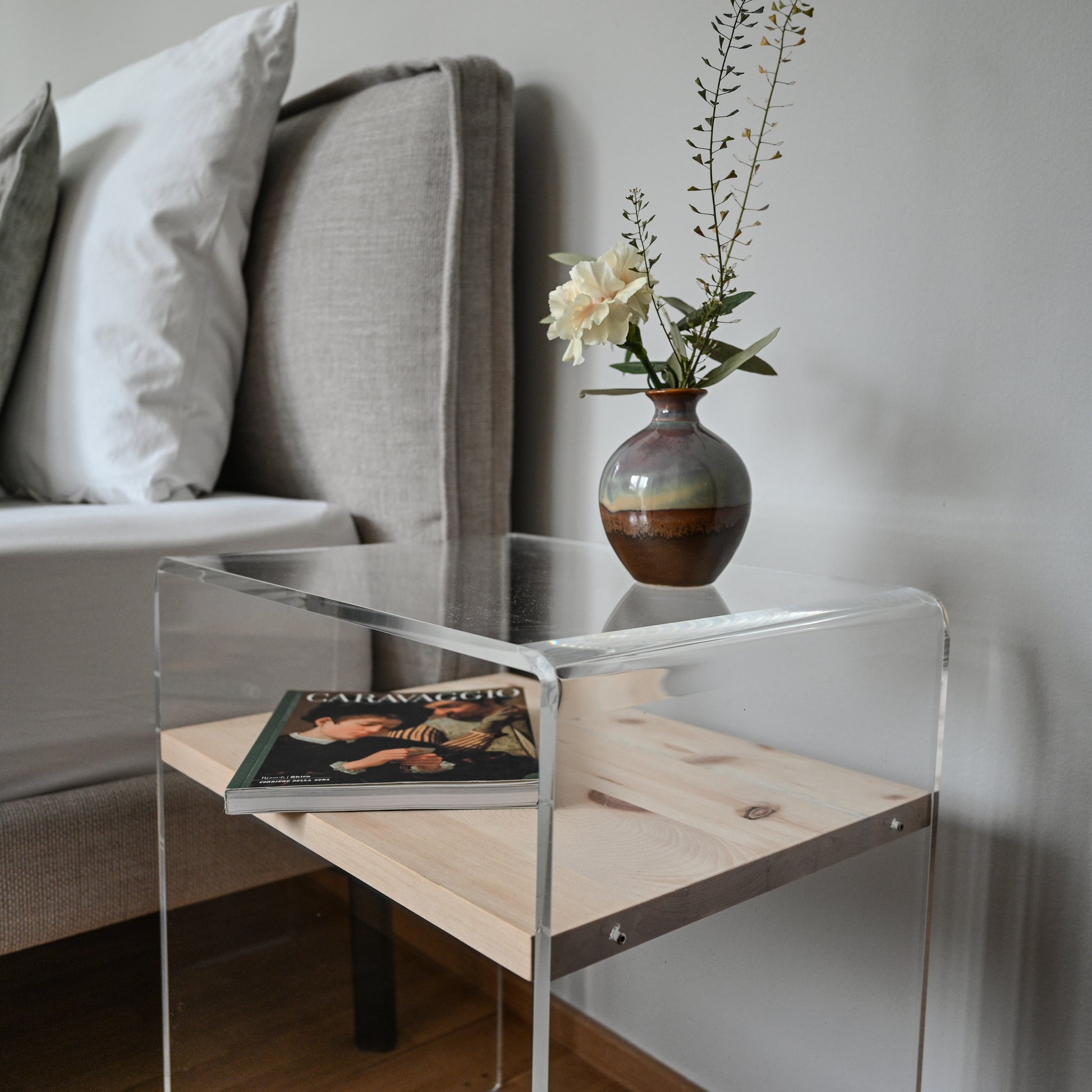 Eine einzigartige Verbindung aus Zirbenholz und Plexiglas – der Nachttisch CURON als echtes Design-Highlight für dein Zuhause.